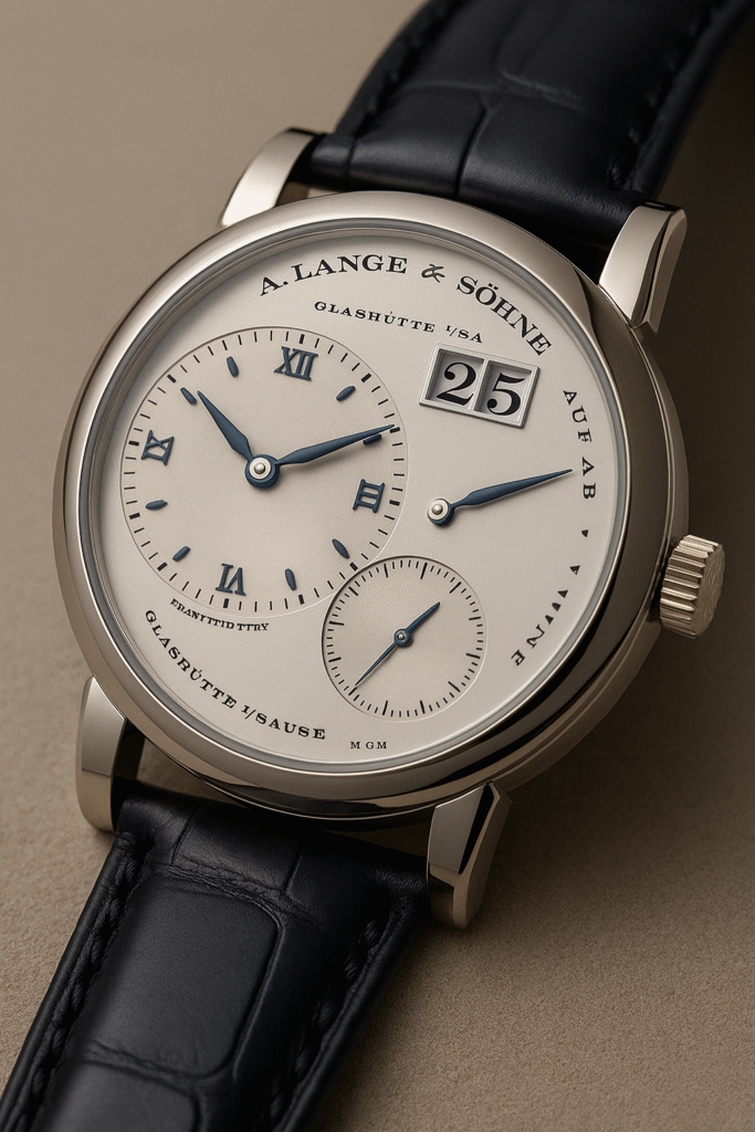 The story begins before the watch. Saxony’s great precision houses were extinguished after the war; the Lange name fell silent until Walter Lange revived the marque, registering the trademark in 1990 and presenting four debut watches on October 24, 1994. Among them, the Lange 1 became the emblem. Collectors often notice the date set to “25” in press images — a nod to the following day’s print announcements, a small private joke that became a tradition. :contentReference[oaicite:1]{index=1}